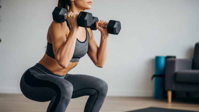 A pair of dumbbells (5–15 lbs), a bench or stable surface, and a mat. Optional: resistance bands for added intensity.