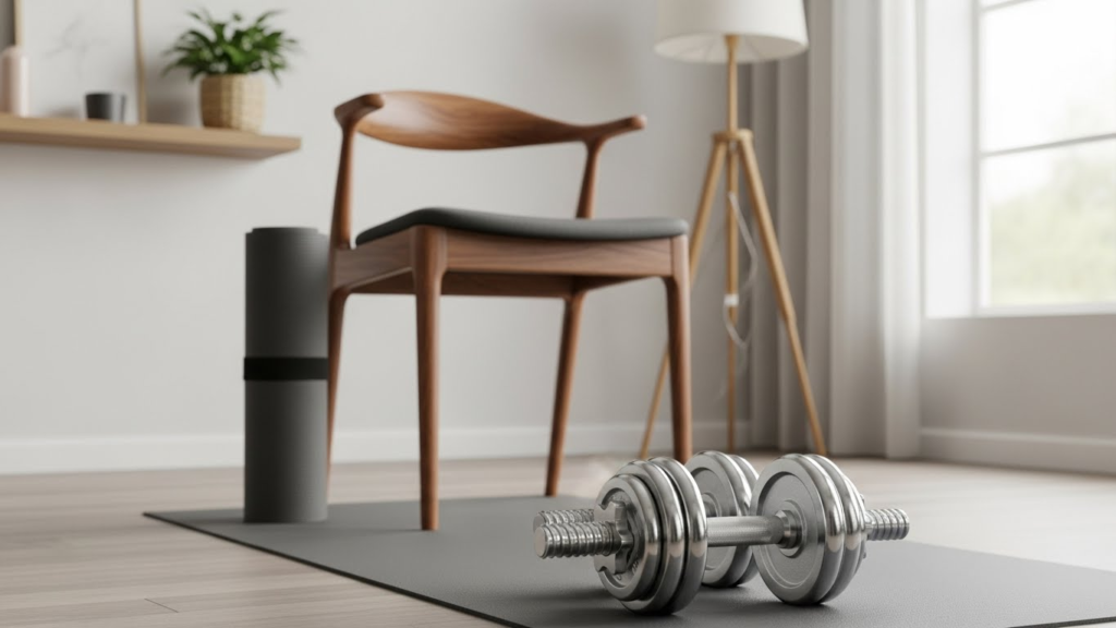 A pair of dumbbells (5–15 lbs), a bench or stable surface, and a mat. Optional: resistance bands for added intensity.